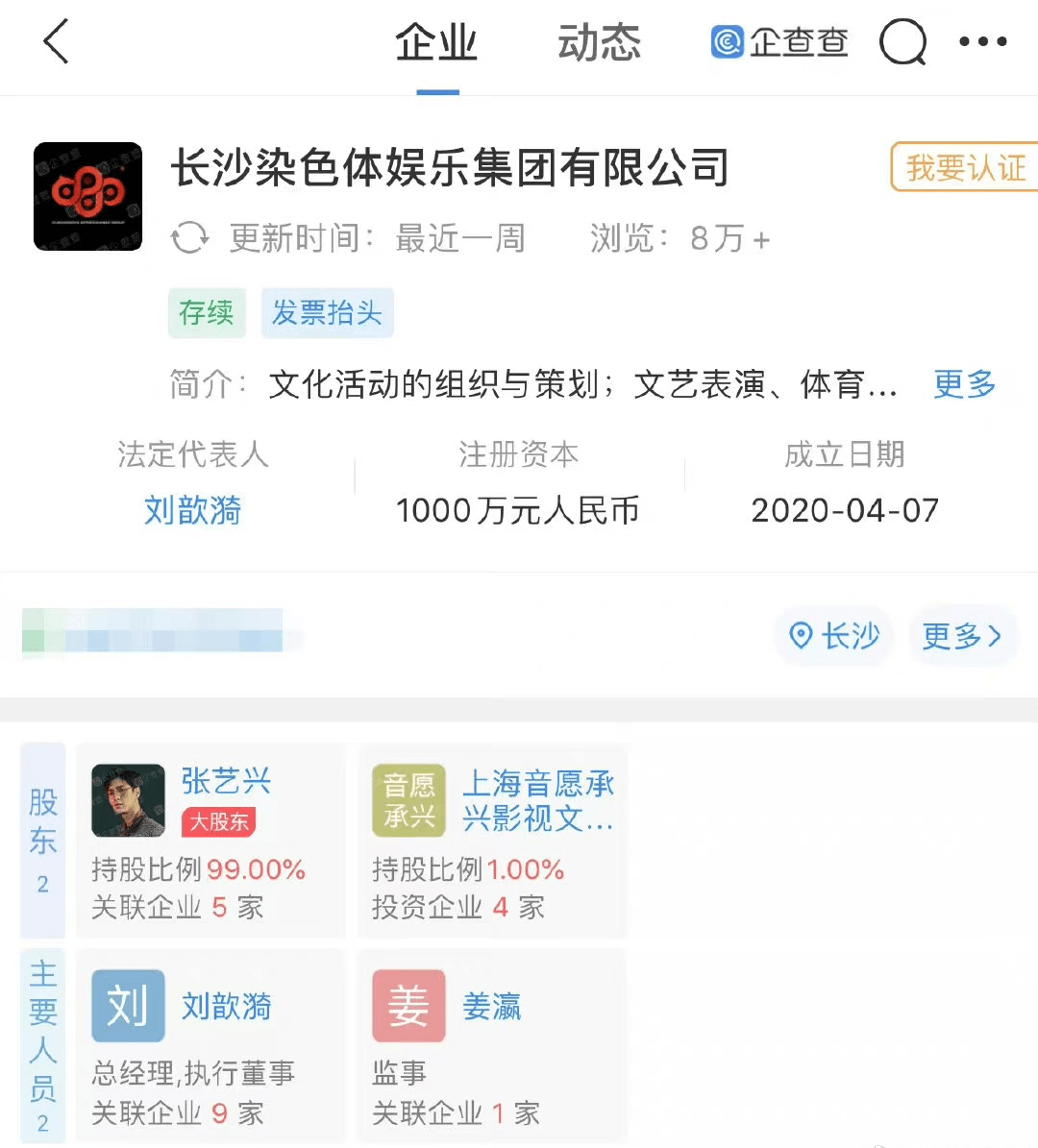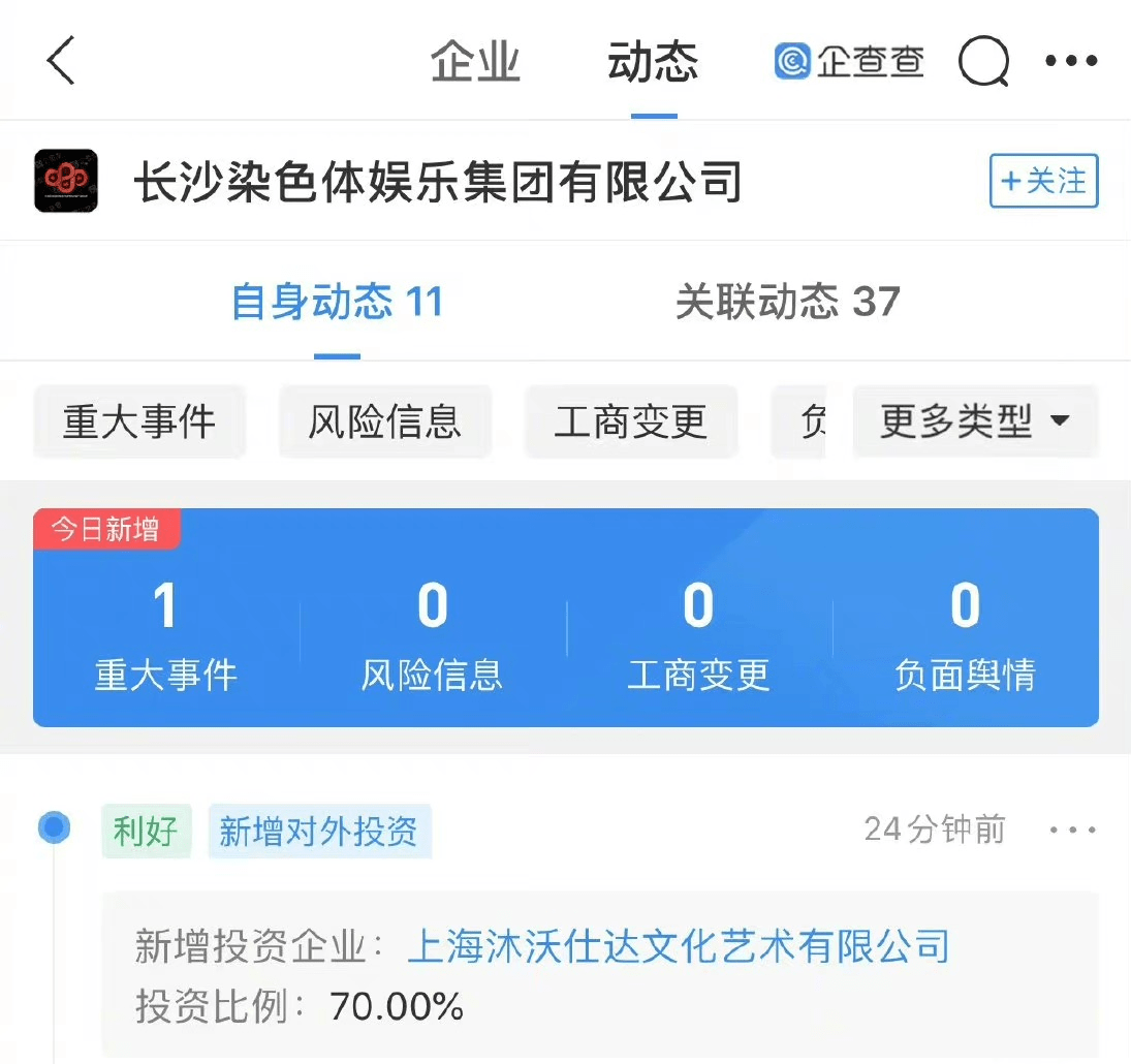 据企查查APP显示,3月9日,上海沐沃仕达文化艺术有限公司成立,大股东为张艺兴持股99%的长沙染色体娱乐集团有限公司,注册资本200万元,经营范围含市场营销策划、组织文化艺术交流活动、广告制造等。