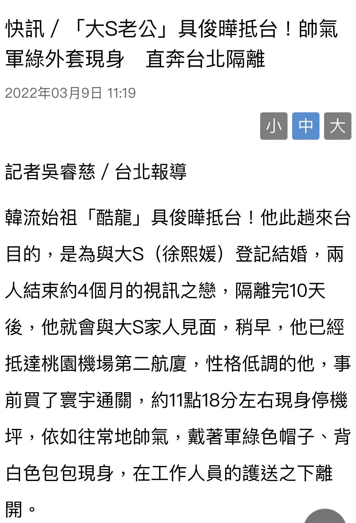 据台媒报道,大S老公具俊晔已经抵达中国台北!他此趟来台目的,是为与大S登记结婚,两人结束约4个月的视讯之恋,隔离完10天后,他就会与大S家人会晤。稍早,他已经抵达桃园机场第二航厦,性格低调的他,事前买了寰宇通关,约11点18分左右现身停机坪,依如往常地帅气,戴着军绿色帽子、背白色包包现身,在工作人员的护送之下分开。不过,碍于新冠肺炎入境政策,他必须先在机场内接收采检,若检验无意外,他就会直奔台北防疫旅社隔离。